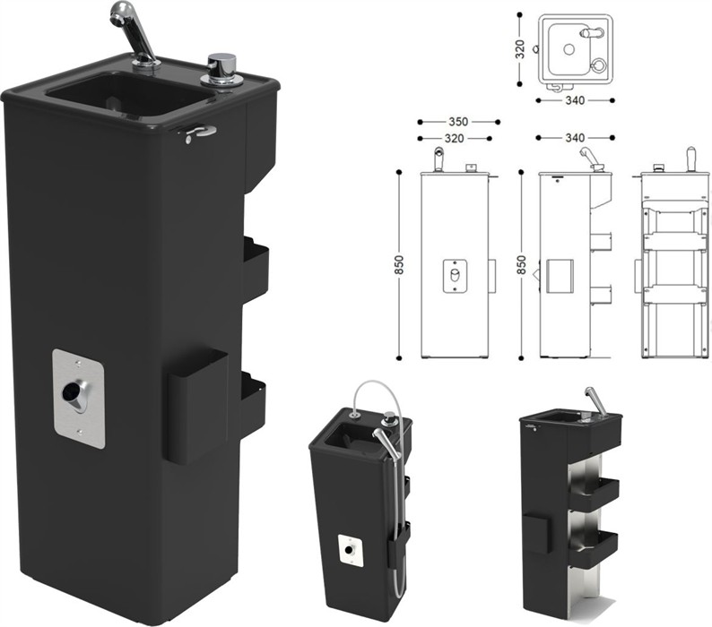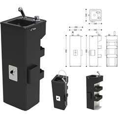 Freistehende Waschsäule aus pulverbeschichtet Edelstahl (schwarz) mit schwarzem Becken aus Kunststoff. Waschbecken mit Mischbatterie und Handbrause mit Brauseschlauch mit 200 cm Länge. Inkl. Ablauf, Sifon und Einlass für Ablauf von mobilem Waschbecken.