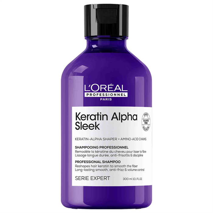 Das patentierte Keratin Alpha Sleek Shampoo ohne Sulfate von L'Oréal Professionnel hat eine luxuriöse, ultracremige Textur und ist mit Keratin-Alpha Shapern und Aminosäureketten angereichert. So reinigt es die Haarfasern sanft, während es das Haarkeratin glättet und stärkt. Das Shampoo macht das Haar geschmeidig weich, spendet Feuchtigkeit und sorgt für sofortigen Glanz sowie Frizz- und Volumen-Kontrolle.*