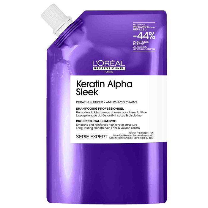 Das patentierte Keratin Alpha Sleek Shampoo ohne Sulfate von L'Oréal Professionnel hat eine luxuriöse, ultracremige Textur und ist mit Keratin-Alpha Shapern und Aminosäureketten angereichert. So reinigt es die Haarfasern sanft, während es das Haarkeratin glättet und stärkt. Das Shampoo macht das Haar geschmeidig weich, spendet Feuchtigkeit und sorgt für sofortigen Glanz sowie Frizz- und Volumen-Kontrolle.*