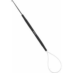 Hier kommt die Schlaufennadel zum Einsatz. Sie erleichtert das Einfädeln der Haarsträhnen und ermöglicht ein kontrolliertes Arbeiten, auch bei kleinen Ringgrössen. Die dünne, fein gearbeitete Schlaufe ist so ausgeführt, dass sie problemlos durch Nano- und Microringe passt.